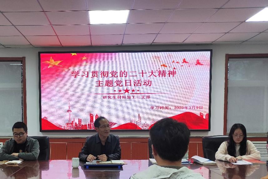研究生材料加工三支部在学院会议室开展了“学习贯彻党的二十大精神”理论学习会,刘斌副院长出席本次活动,参会人员为研究生材料加工三支部全体党员。本次学习会目的在于深入学生党员群体,领会党的二十大精神内涵,加强学生党员的党性修养。