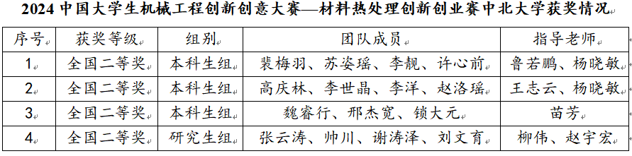 裴梅羽、高庆林、魏睿行和张云涛四支队伍分别以作品《大型轧钢机轴承的热处理工艺设计》、《高速钢齿轮滚刀表面强化的热处理工艺设计》、《大型渗碳齿轮的选材与热处理工艺》和《耐腐蚀滚动轴承热处理工艺》荣获大赛二等奖。