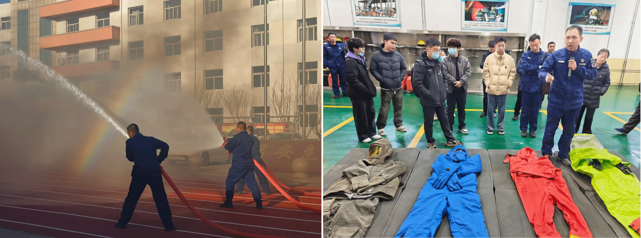 活动首站设在专业的应急救援实训基地。启动仪式后,师生们率先学习灭火器正确使用方法并完成实操演练。随后,大家观摩并亲身体验了多项救援项目,包括高科技救援装备展示、作战服与空气呼吸器穿戴、水带连接、单兵救援等。仿真实训馆内的培训内容更具系统性与深度:从安全防护装备认知、安全鞋帽冲击体验,到 VR 虚拟隐患排查、地震小屋模拟、烟热逃生演练,再到心肺复苏、厨房火灾扑救等实用技能训练,一系列高度仿真的互动演练,有效提升了师生的安全防范意识与应急处置能力。