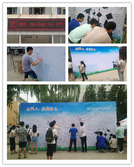 6月18日,在“父亲节”这个特殊的日子里,为了给毕业生们提供一个表达对母校、同窗、导师深厚情感的平台,学院于文韬二号楼公寓楼下开展了“老铁们,材料人毕业留言活动,约吗”签名留言活动。毕业生的万千感慨,在校生、老师乃至楼管阿姨的祝福,镌刻在字里行间,温柔荡漾:“祝母校越来越好”、“曾经千万遍吐槽,如今却最是不舍”、“来时荏苒,去时匆匆”、“遇见你,是我的小幸运”……除了毕业感言,还有就是对学校、老师以及同学的祝福。留言墙给毕业生提供了抒发感慨与激动的渠道,字里行间充盈着他们心中浓的浓师生之意、友谊之情和惜别之念,让即将离校的材料学子在母校留下永远的足迹。