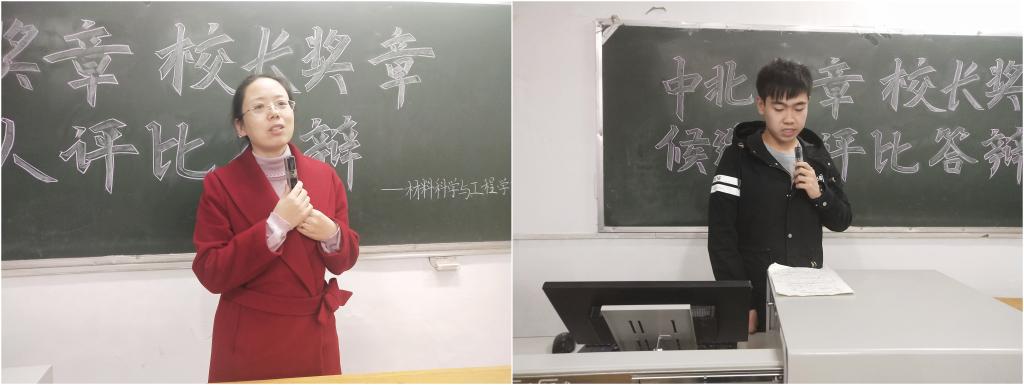 主持人宣读评选细则后,答辩便开始了。参加中北奖章答辩的15030442班和15030Z01班班级代表分别从学风建设、制度建设、思想建设、活动组织和荣耀等方面对各自班级进行了精彩的介绍,展现了各班的特色和风采。接着付燕同学进行了校长奖章的答辩,她从思想、工作、学习、科技创新四个方面对自己进行了介绍,现已保送至华南理工大学,曾获多种奖项。最后郭云霞老师对答辩的班级与同学进行点评并宣布最终答辩结果;同时从学习、心理、创新等方面向同学们提出了诚恳的建议,希望每一个同学都能够以优秀的同学及班级为表率和榜样,在完成学业的同时,以更高的要求约束自己,使自己向更高的方向前进。