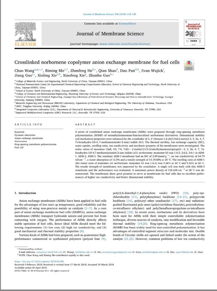 王超教授主要从事燃料电池及离子交换膜方面研究。主要科研项目有国家自然科学基金青年基金、科技部国家研发计划项目政府间国际科技创新合作重点专项项目(子课题)、山西省重大专项子课题等项目10余项;国家发明专利6项;以第一作者与通讯作者发表论文15篇,其中SCI、EI收录11篇,其中ESI热点和高被引论文6篇。此次入选论文为《Crosslinked norbornene copolymer anion exchange membrane for fuel cells》。本文采用开环易位聚合得到聚降冰片烯类阴离子交换膜,引入交联剂提高膜性能,并通过理论计算探究离子传导机理。