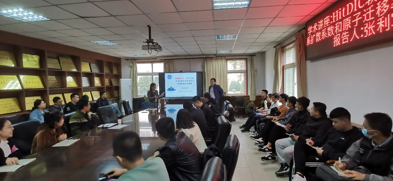 张利军教授在报告中指出,可靠的动力学信息对于理解多组元/多主元合金制备和服役过程的微观结构演变是必不可少的。当前建立扩散动力学数据库的方法从扩散系数出发,按照从低组元到高组元体系的顺序进行,无法实现复杂多组元/多主元体系扩散力学数据库的高通量自动化获取。为此,张利军教授及其课题组基于前期开发的HitDIC软件(High-throughput Determination of Interdiffusion Coefficients, //hitdic.com),搭建了从海量实测成分-距离曲线出发,进行自动化挖掘互扩散系数和原子迁移率数据库的基础框架。该框架通过在自动化工作流程中引入数据清洗、特征工程、正则化、不确定性量化和并行计算等技术,实现了高质量的扩散动力学数据库的建立,成功应用于CoCrFeMnNi高熵合金 “缓慢扩散”效应的系统讨论,并验证了所建立框架的可靠性和高效率。张利军教授的精彩报告受到了在场师生的一致好评,报告完毕后大家积极提问交流,现场展现出了浓厚的学术氛围,学术报告取得圆满成功。