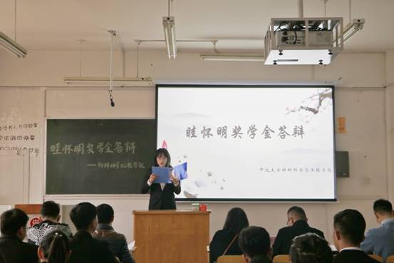 举行了眭怀明奖学金的答辩活动。此次活动由扬州峰明光电新材料有限公司副总经理张为平,学院殷炳叶老师、郝诗韵老师、贾越老师、田晋忠老师、鲁若鹏老师、刘琴老师、褚嫱老师、张维叶老师共八人列席会议担任评委。研究生和本科生共35人参加答辩。