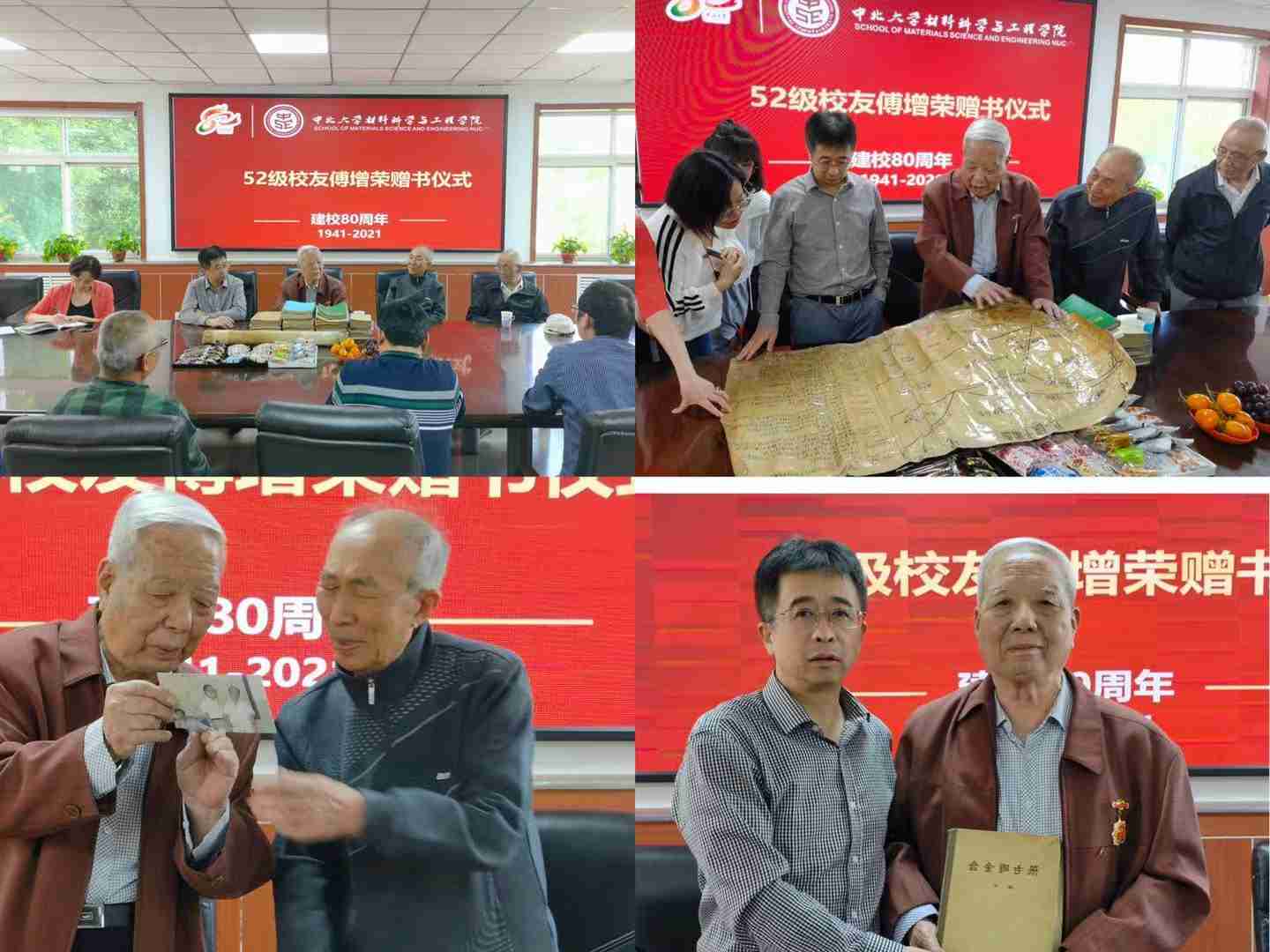 52级金属材料热处理专业的86岁老校友傅增荣带着珍贵的礼物回到学院,以特有的方式为母校80周年献礼。周铁城、张春明、胡保全和院领导共同见证了这一暖心时刻。