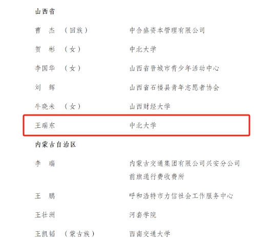 红杏视频 王瑞东同学获得第十四届“中国青年志愿者优秀个人奖”