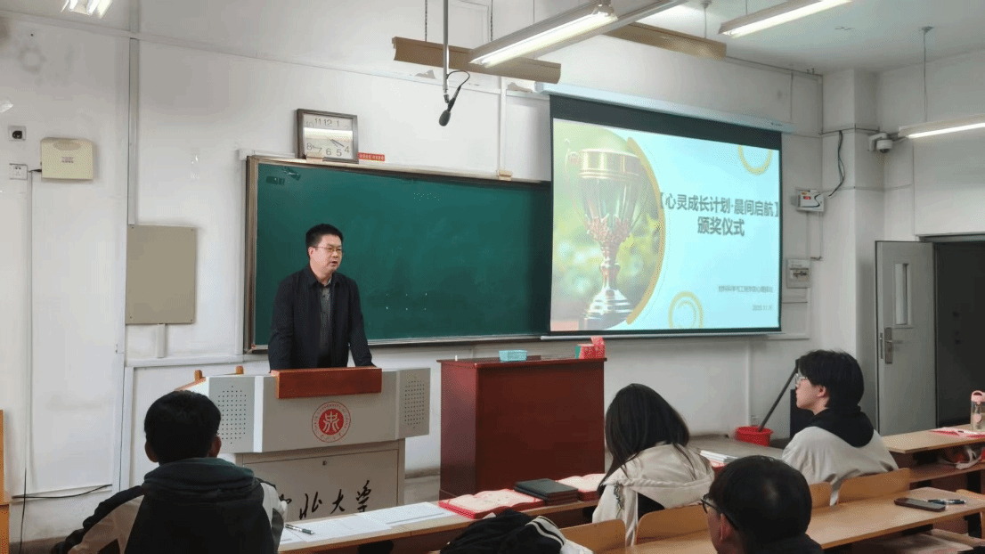 榜样引领,晨光映初心。获奖学生代表韩宁怡、刘佳、刘伟康同学依次上台发言,他们结合自身参与活动的经历,讲述了从“被动坚持”到“主动享受”的转变过程,并号召全体心理委员不负期望,携手并进,在新一阶段的学习与工作中继续“向光而行”。
