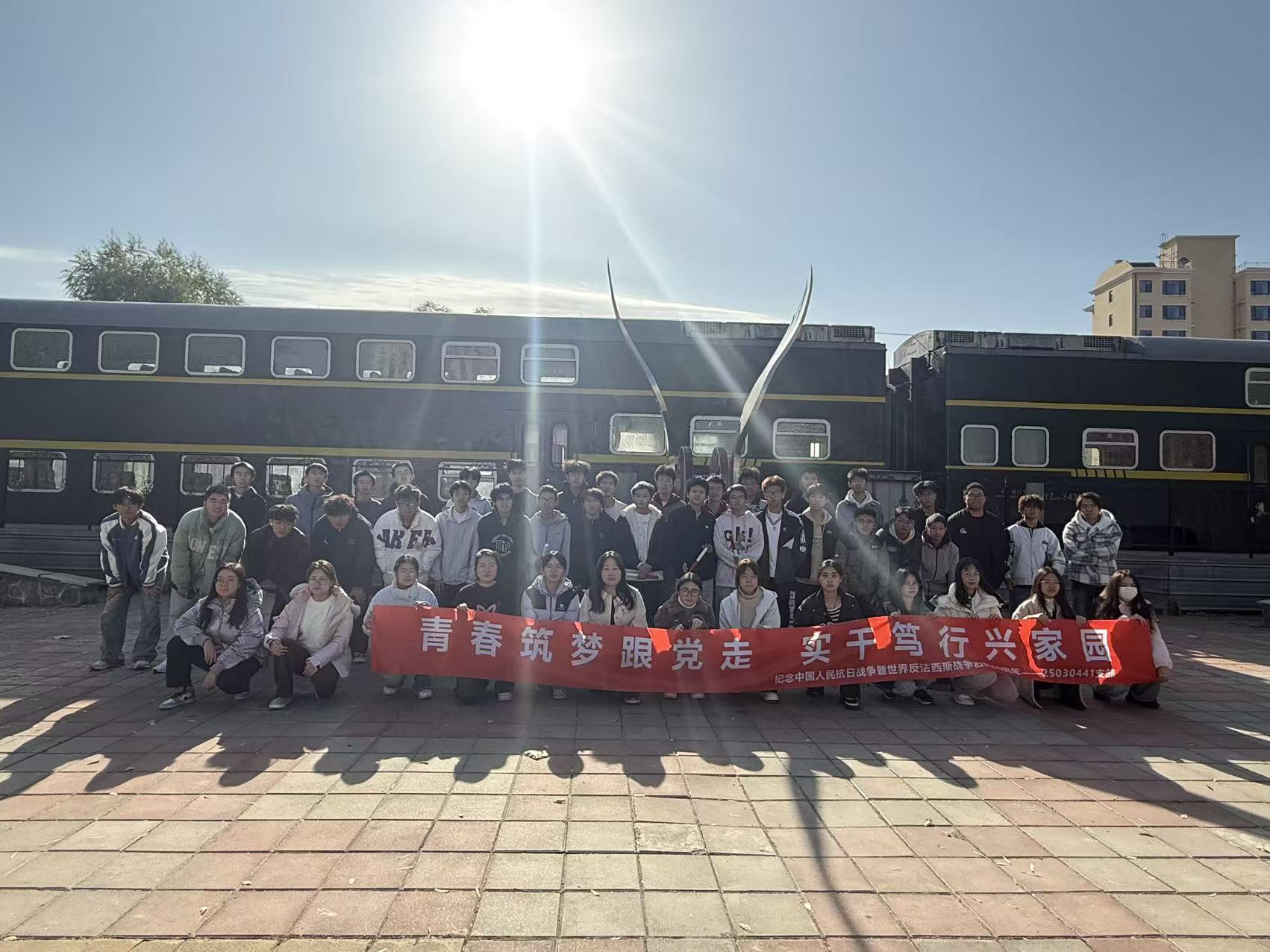 所有队伍均圆满完赛,终点线前掌声欢呼声此起彼伏。活动尾声,全体同学齐聚铁路主题公园,高举手臂齐喊“铭记历史,强国有我!”的铿锵口号,将抗战精神融入青春誓言,合影定格热血时刻。