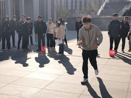 第一个项目为“猩猩接力”。此项游戏由第一位参赛队员从起点左右手臂各持一个篮球,双腿夹持一个排球,走向终点后返回至起点传递给第二人。尽管看上去动作滑稽,但同学们的竞技精神令人敬佩,球掉了,跪地夹起来,立马向终点冲去。不扭捏,不服输,不放弃,充分彰显了材料学子积极向上的精神面貌。