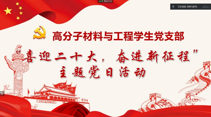 高分子材料与工程学生党支部在腾讯会议开展了“喜迎二十大,奋进新征程”主题党日活动。本次党日活动由支部书记郝诗韵同志主持,支部36名党员、10名发展对象和23名积极分子参加了活动。