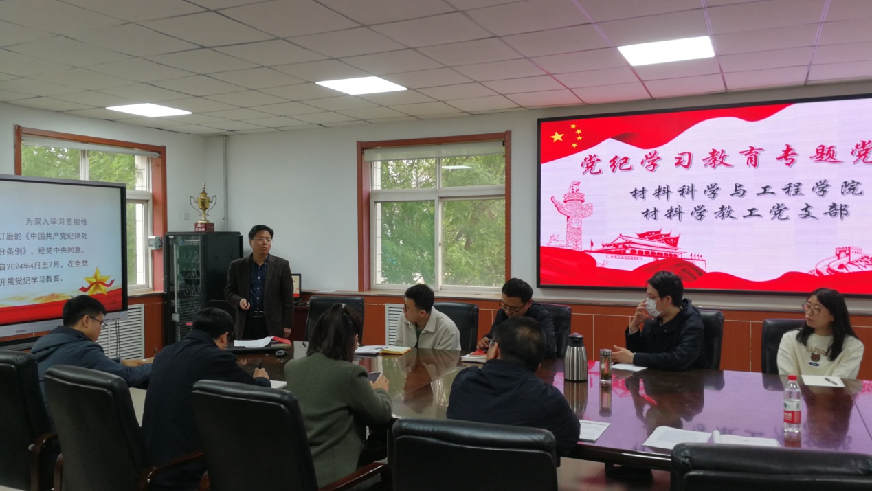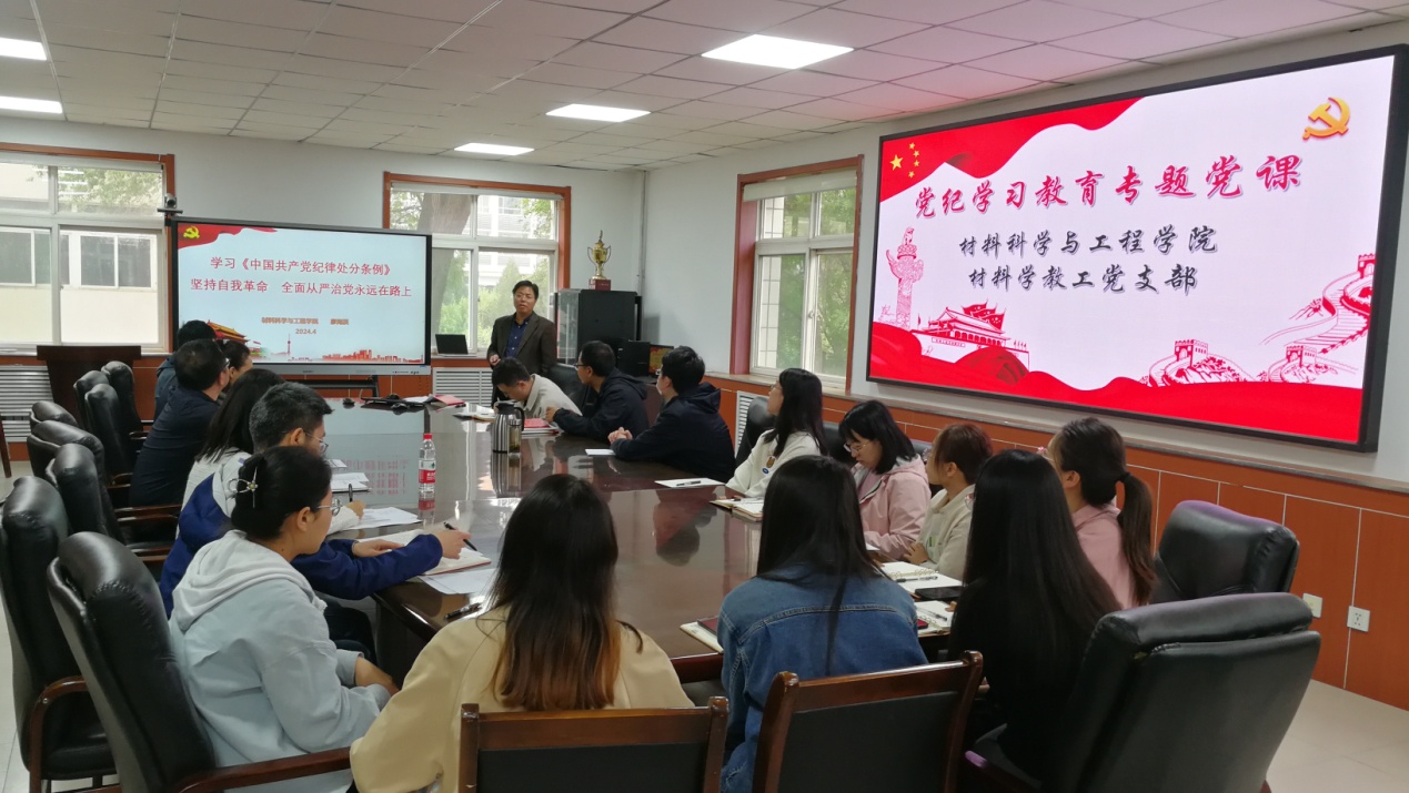 为深入学习贯彻习近平总书记关于党纪学习教育的重要讲话和重要指示精神,进一步将《中国共产党纪律处分条例》(以下简称条例)学深学透学到位,材料学教工党支部全体党员于4月29日下午在笃学楼二层大会议室开展了党纪学习教育第一次专题学习。会议特邀请学院党委书记廖海洪同志讲了主题为“学习《中国共产党纪律处分条例》,坚持自我革命,全面从严治党永远在路上”的党课。会议由支部书记渠永平同志主持,副院长王超、党委委员谢江波等也参加了学习。