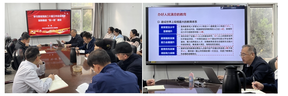 王强院长的讲解紧扣党的二十届三中全会精神,深入讲解了教育科技人才体制机制一体改革的重要性,提出了学院在人才培养与科学研究方面的具体要求。他强调,广大党员务必深刻理解和把握全会精神,要将全会精神与实际工作相结合,为推动改革发展贡献力量。在人才培养方面要做好思政工作、建好大平台、赋能大成长、实现大价值,要“以赛促教,以教促学”。