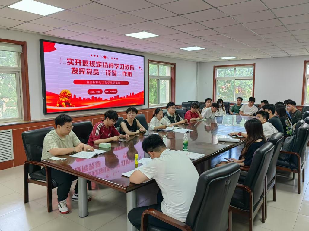 为扎实开展深入贯彻中央八项规定精神学习教育,教育引导广大党员同志锤炼过硬作风,强化责任担当,发挥先锋模范作用,2025年6月8日,复合材料与工程学生党支部书记李静同志以“扎实开展规定精神学习教育,发挥党员先锋模范作用”为题,为本支部成员讲授专题党课。